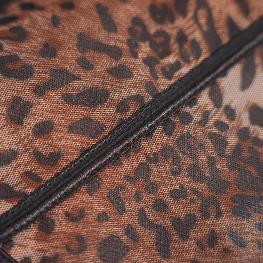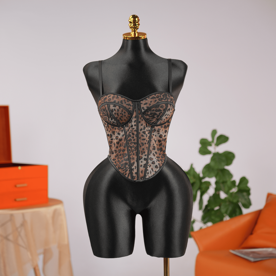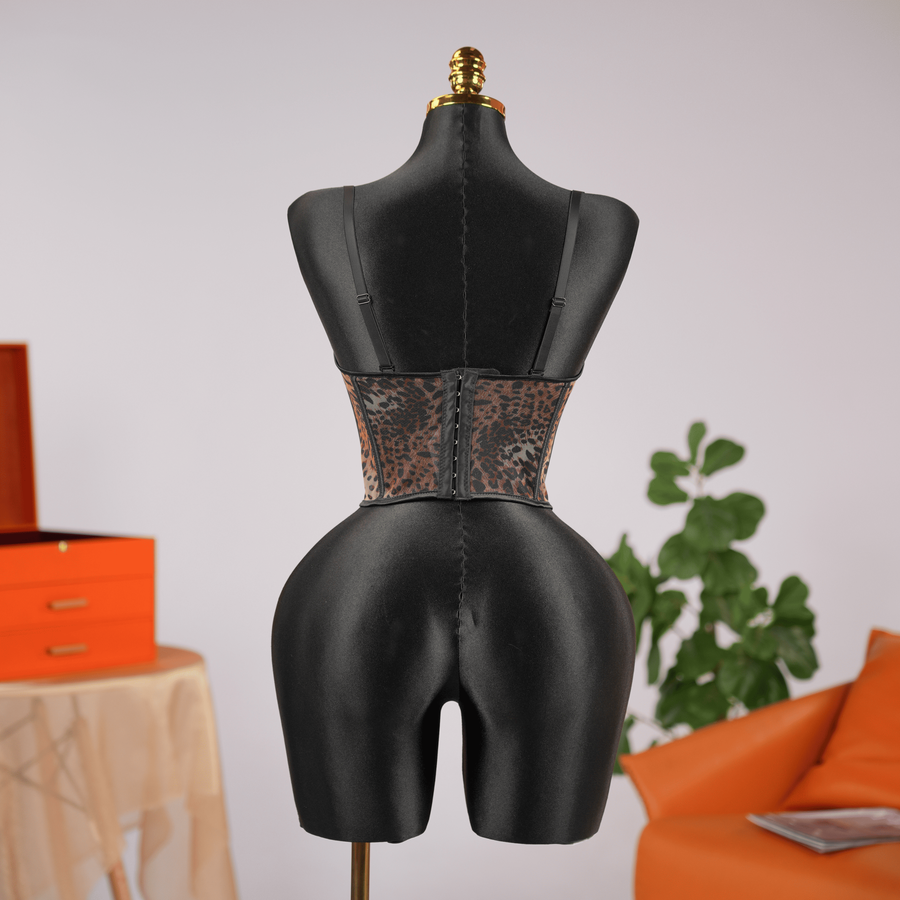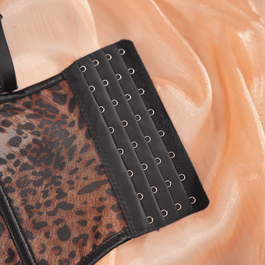 Highlight: sculpted corset in bold leopard mesh with clean, defined lines.