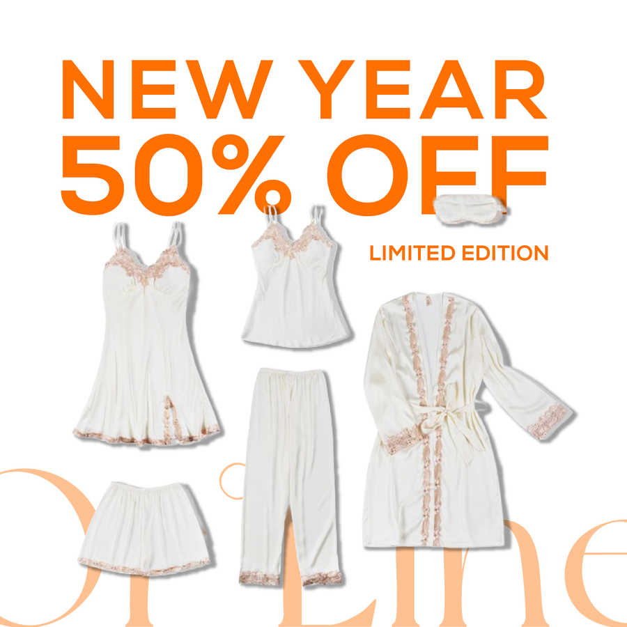 بيجاما ستان 6 قطع أبيض – White Satin Pajama Set 6 Pieces (Free Size)