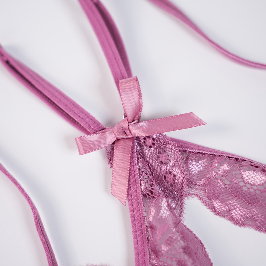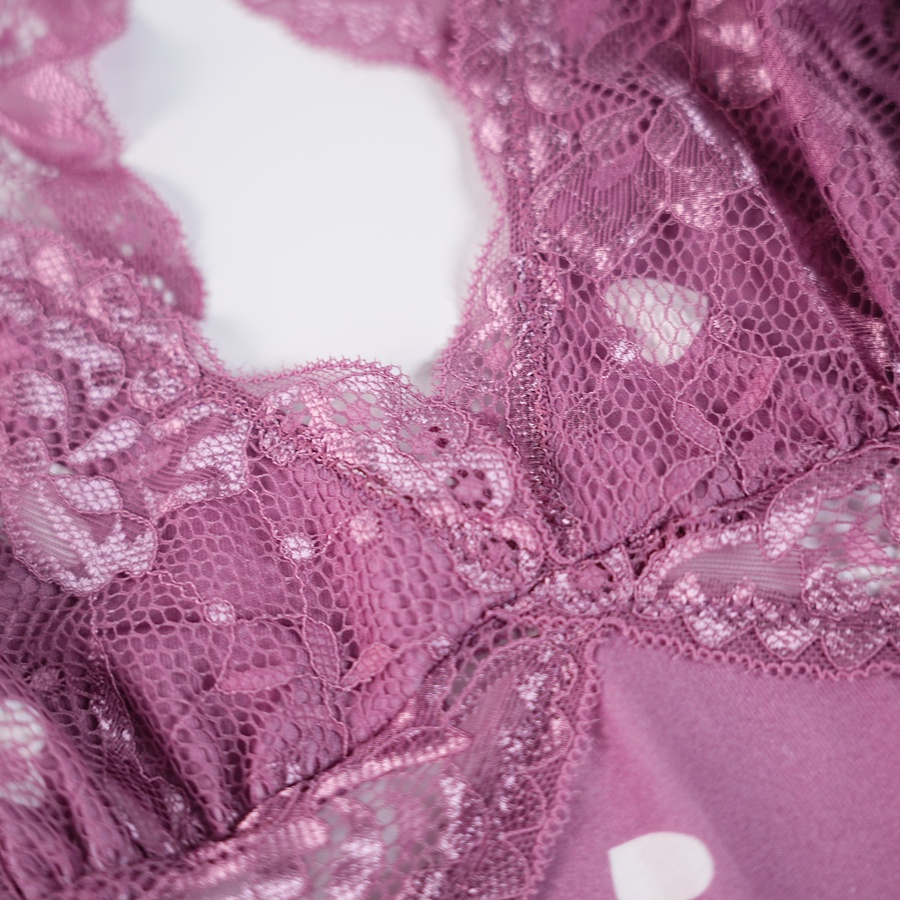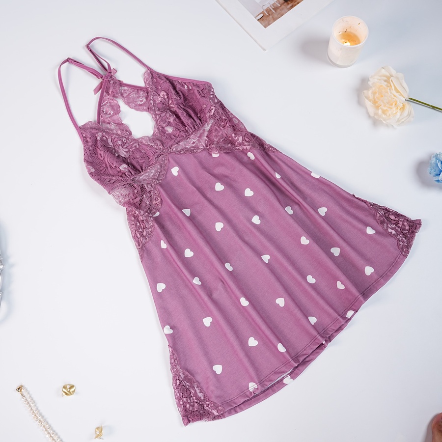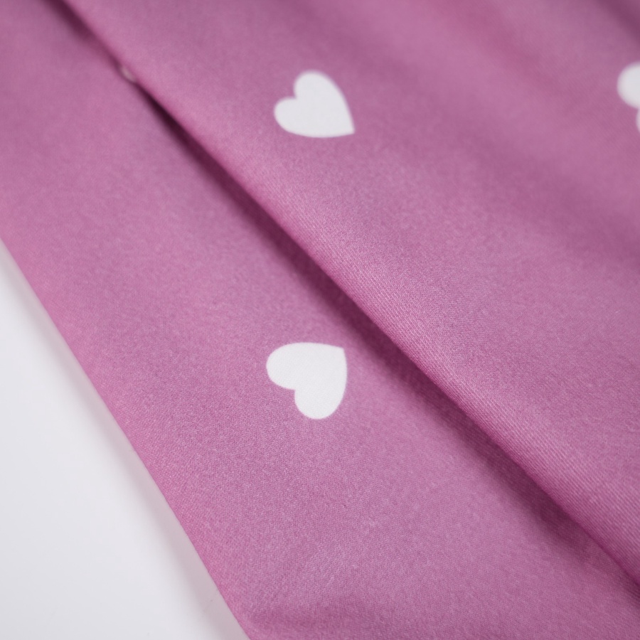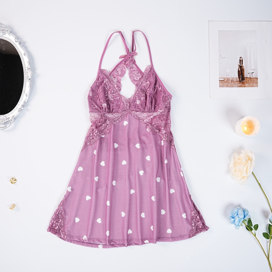 فستان بينك مزين برسومات قلوب بيضاء ودانتيل ناعم، مع ظهر على شكل X لإطلالة أنثوية بسيطة وجميلة.