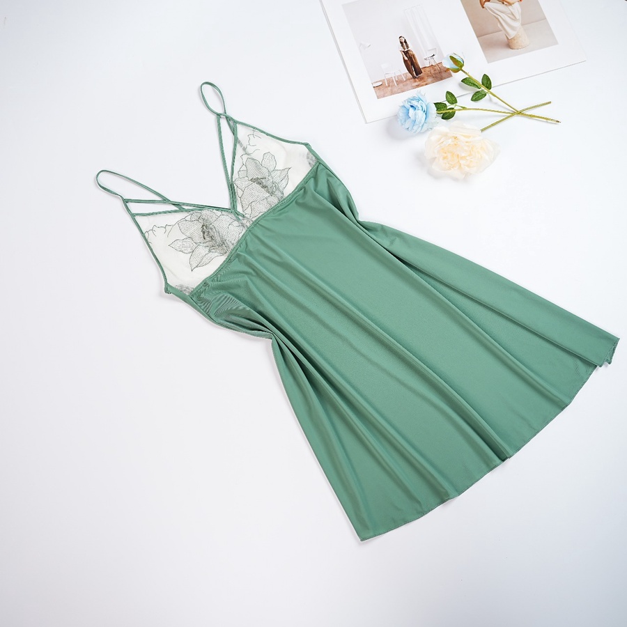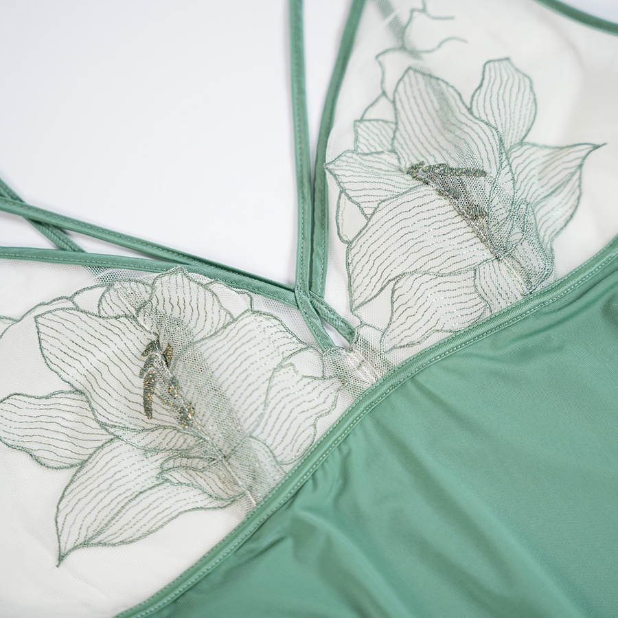 فستان لانجيري باللون الأخضر اللامع، مزين بورود رقيقة على منطقة الصدر مع تفاصيل أنثوية جذابة، فري سايز بحمالات قابلة للتعديل لراحة وأناقة مثالية.