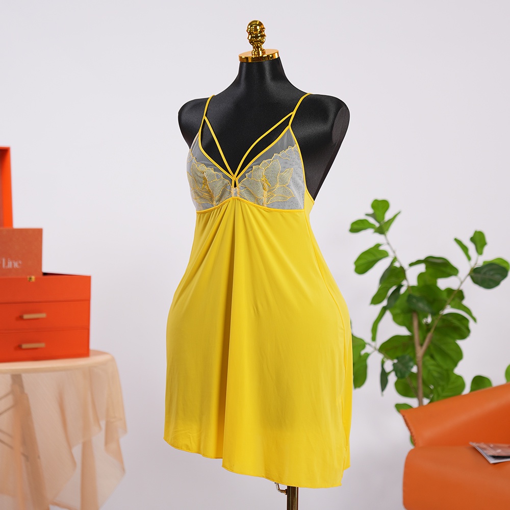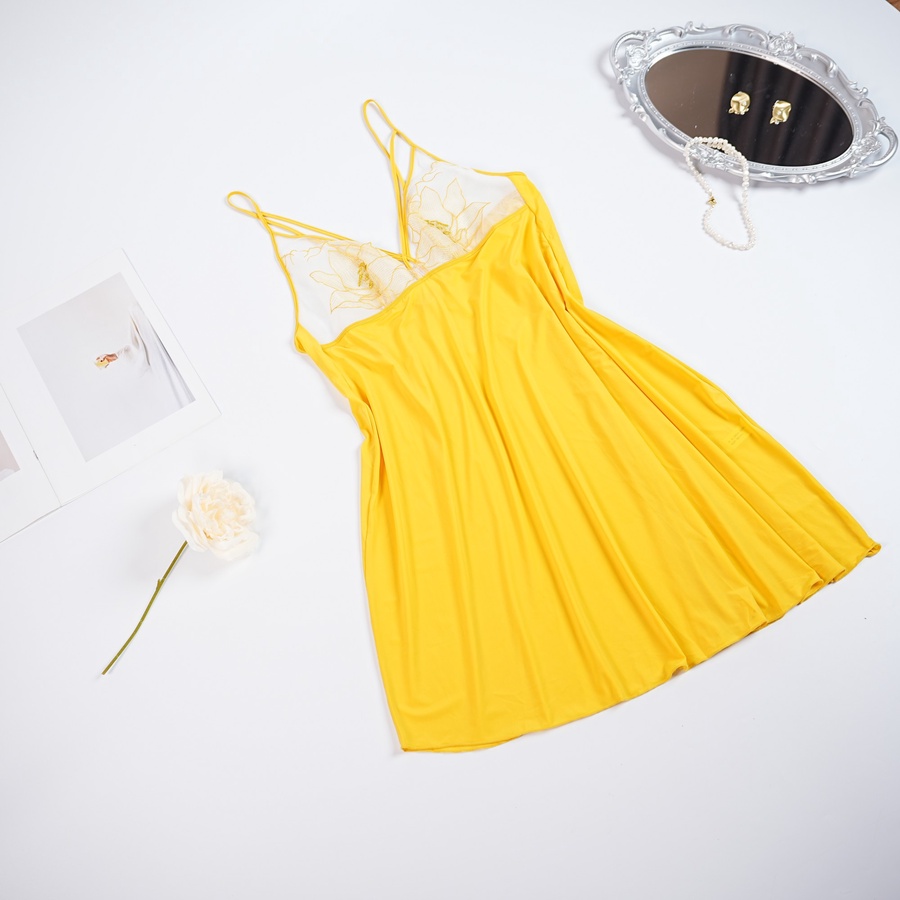 فستان لانجيري أنيق باللون الأصفر اللامع، يزينه وردتان على الصدر لإطلالة مفعمة بالأنوثة، فري سايز مع حمالات قابلة للتعديل لراحة وأناقة متكاملة.