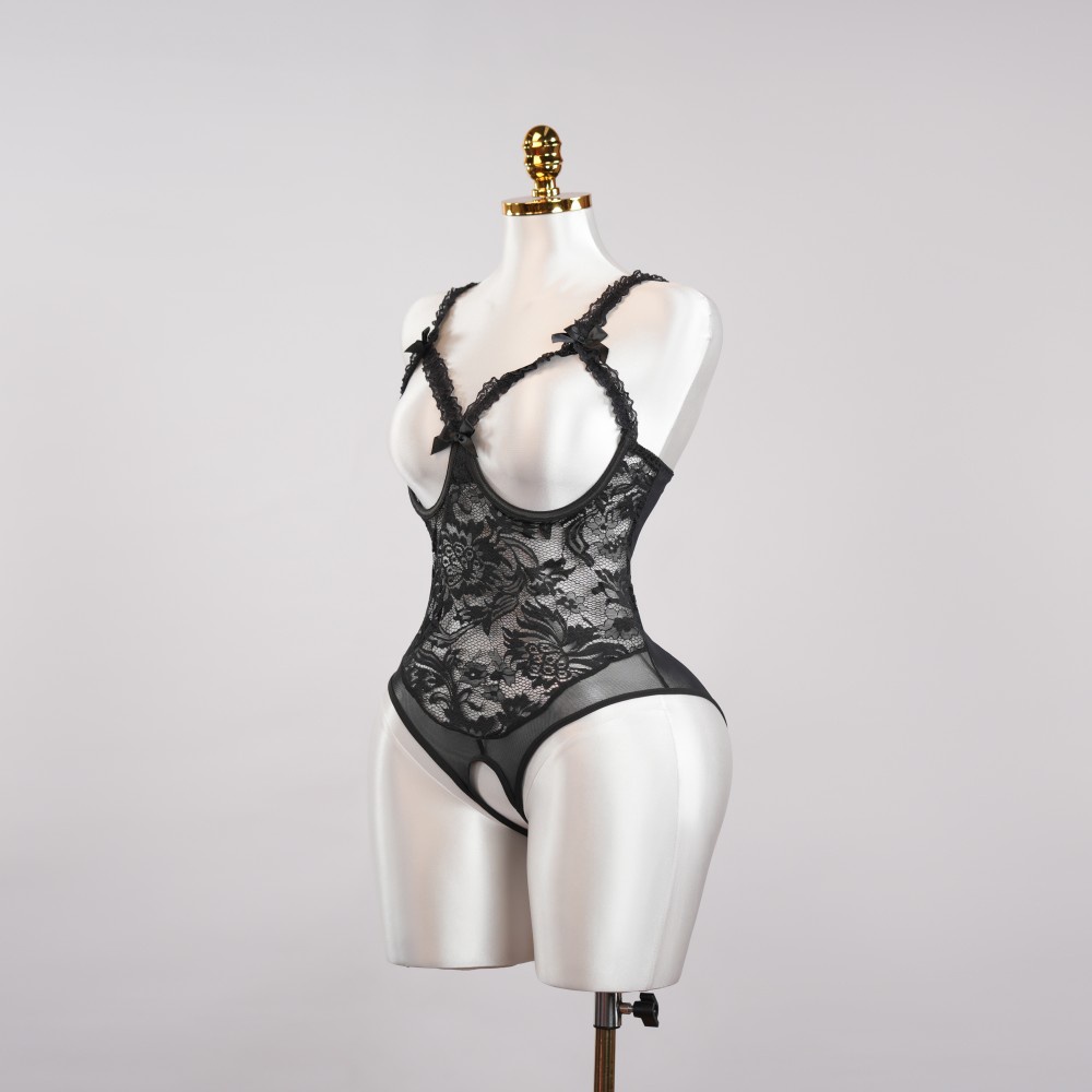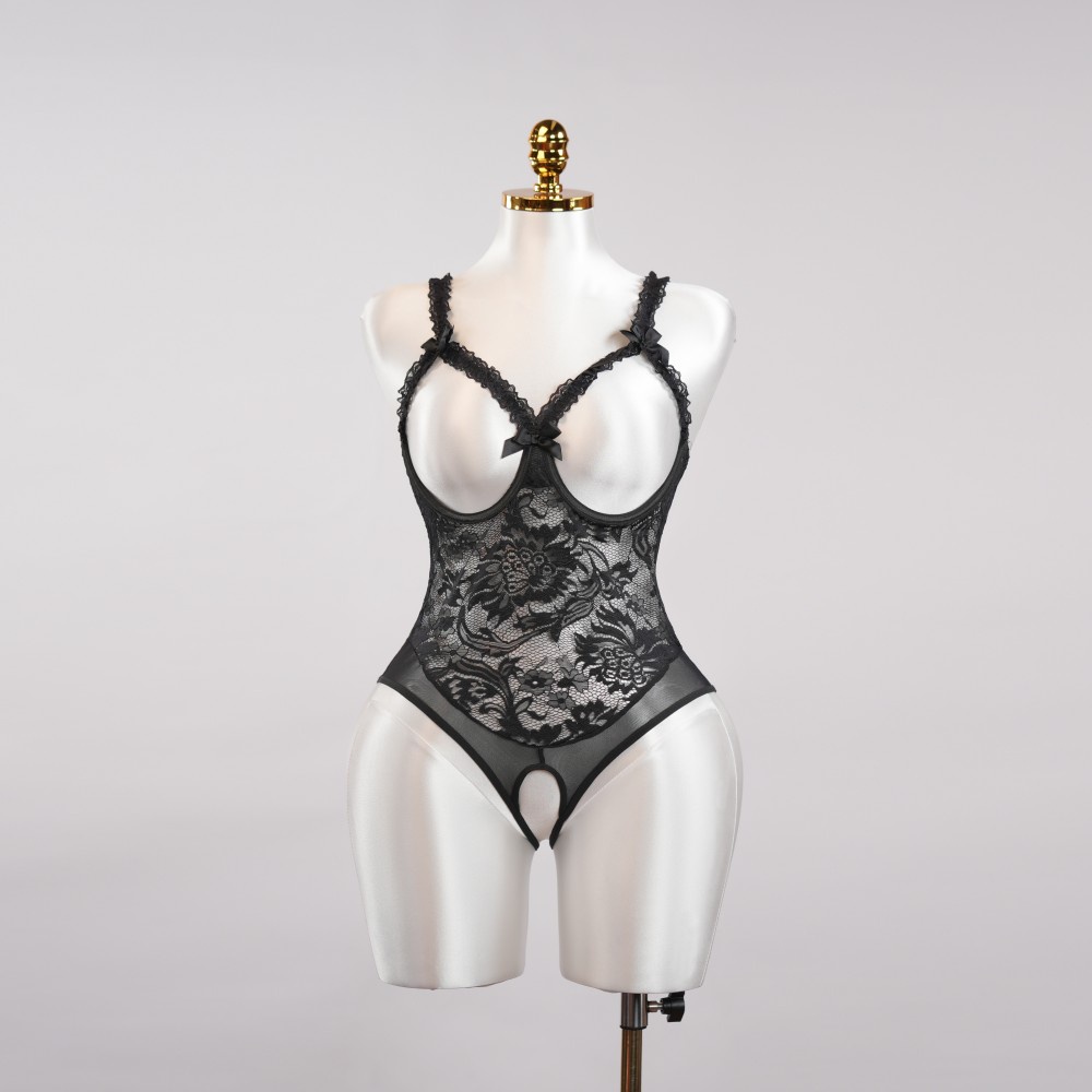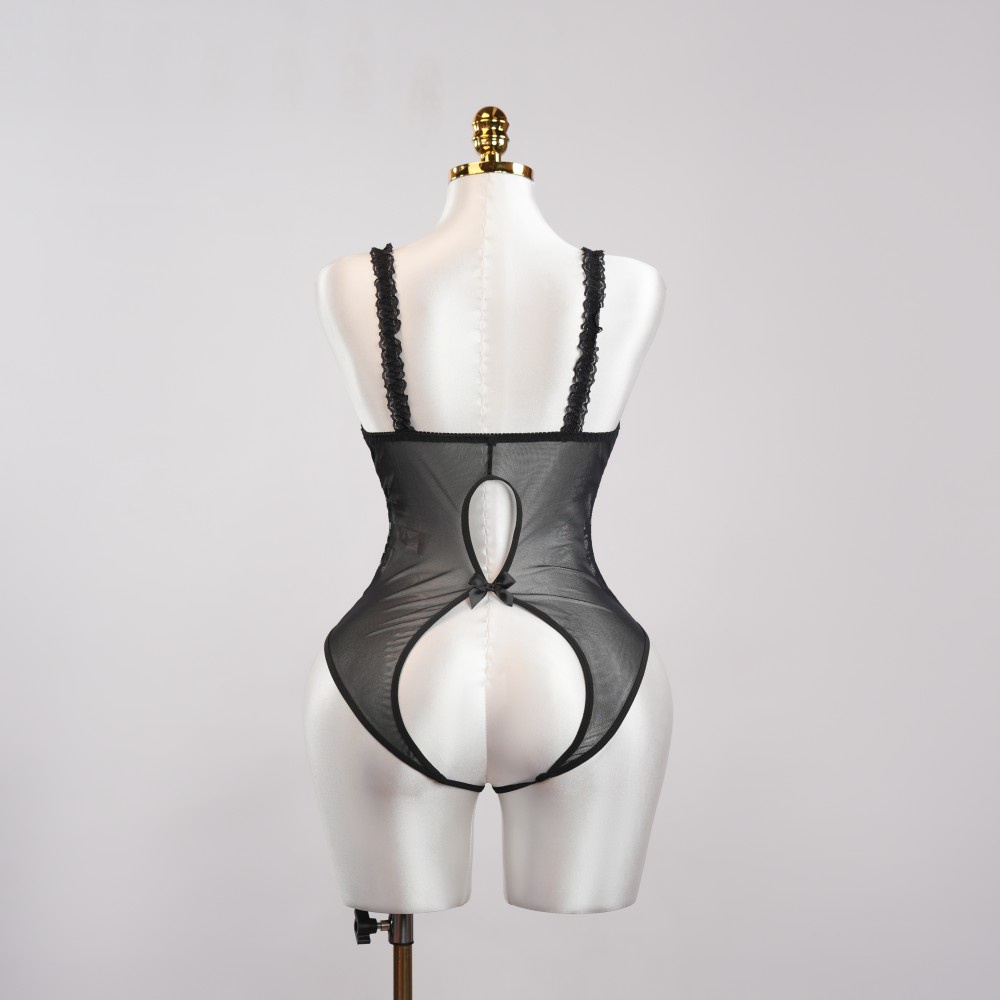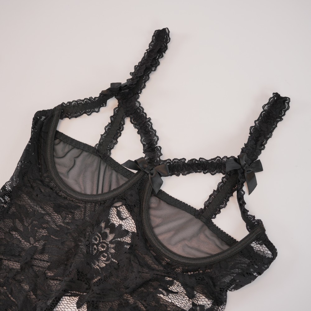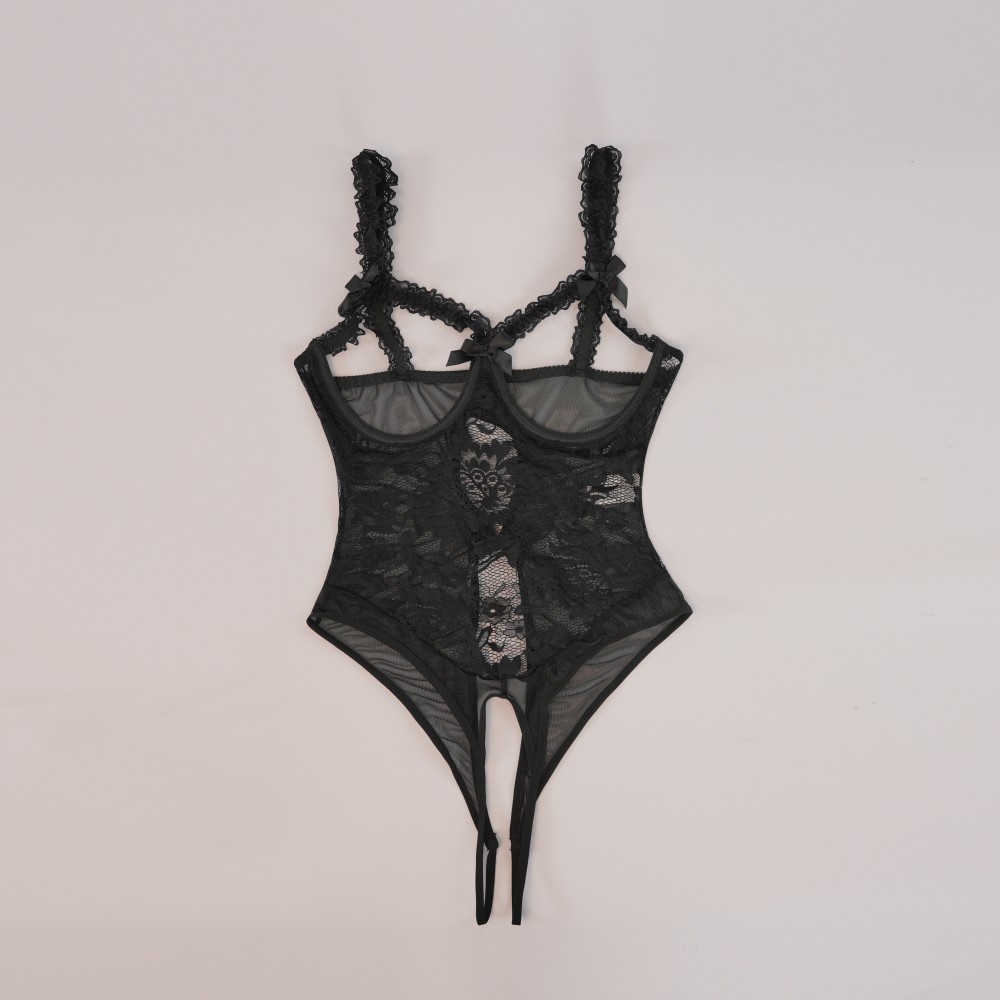 Black Floral Lace Embroidered Open Crotch Bodysuit