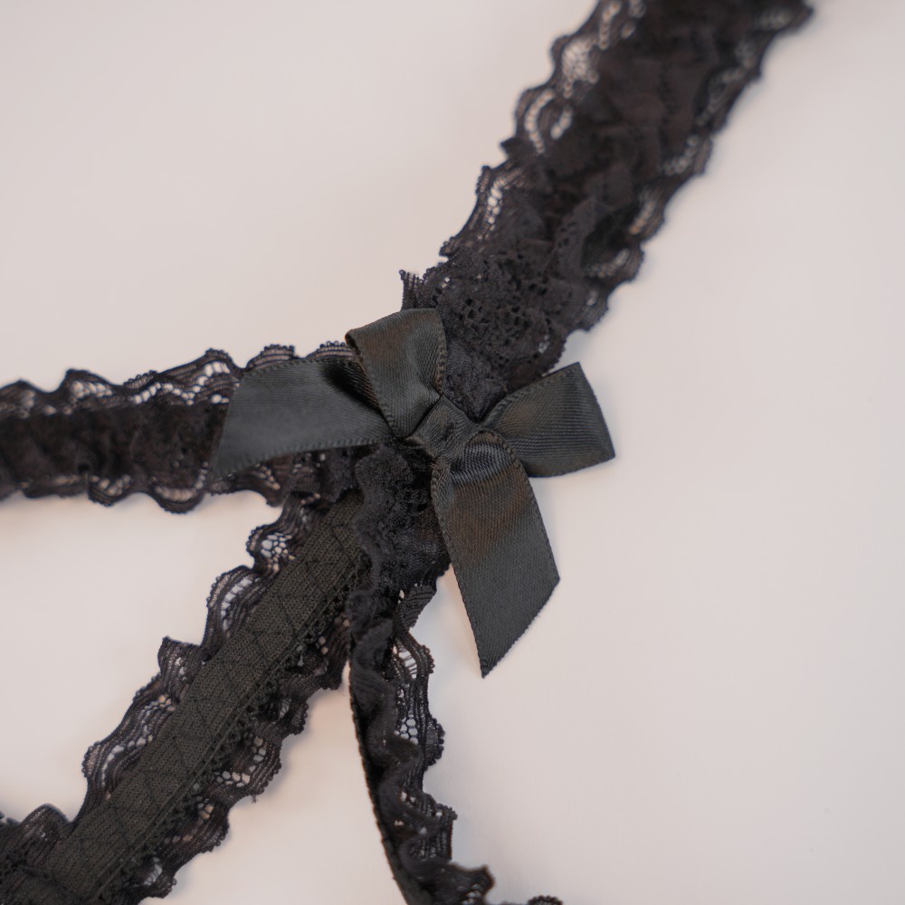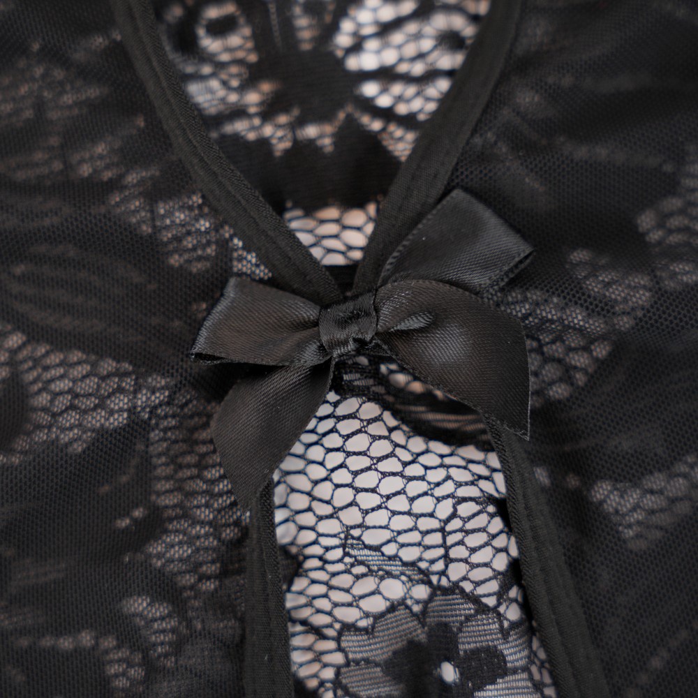 مصنوعة من الدانتيل الأسود الفاخر المزين بأنماط زهرية متقنة وحواف مسننة، ليخلق القماش تأثيراً طباقياً خفيفاً يكشف الجلد بأناقة.