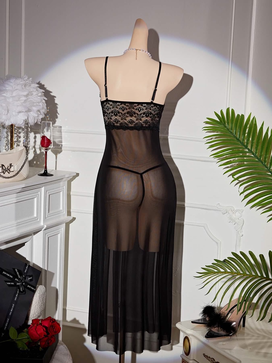 مصنوع من دانتيل رقيق يتميز بأنماط زهرية معقدة، هذا الفستان الشفاف يبرز منحنياتك بشكل أنيق مع الإشارة إلى بشرة جذابة.