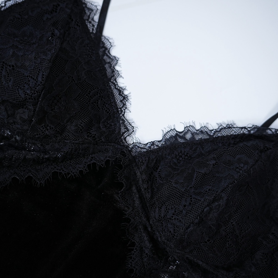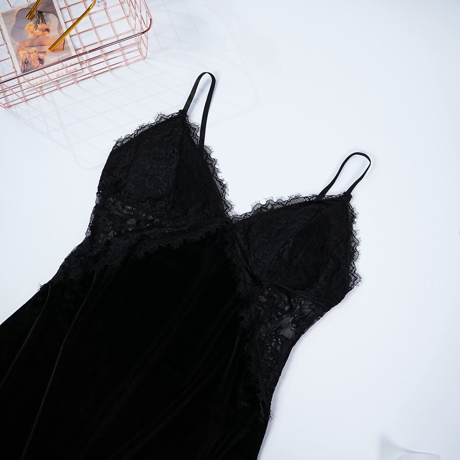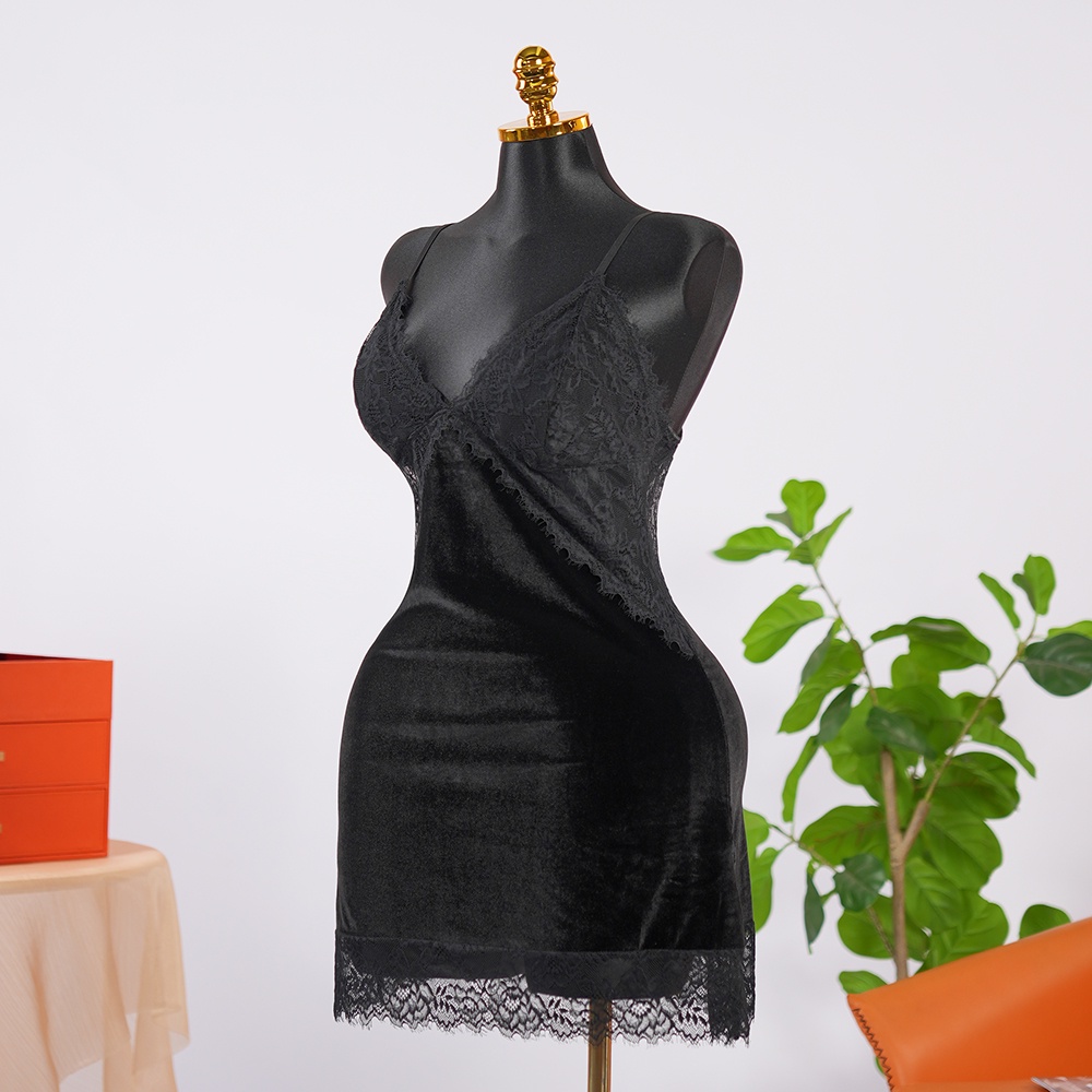 استسلمي لسحر الليل مع هذه القطعة الأنيقة التي تجمع بين دفء القطيفة وهمسات الدانتيل الرقيق لمسة واحدة تكفي لتشعري بنعومة قماش القطيفة الفاخر وهو ينساب على بشرتك بينما يروي تطريز الدانتيل قصة من الأنوثة والغموض.