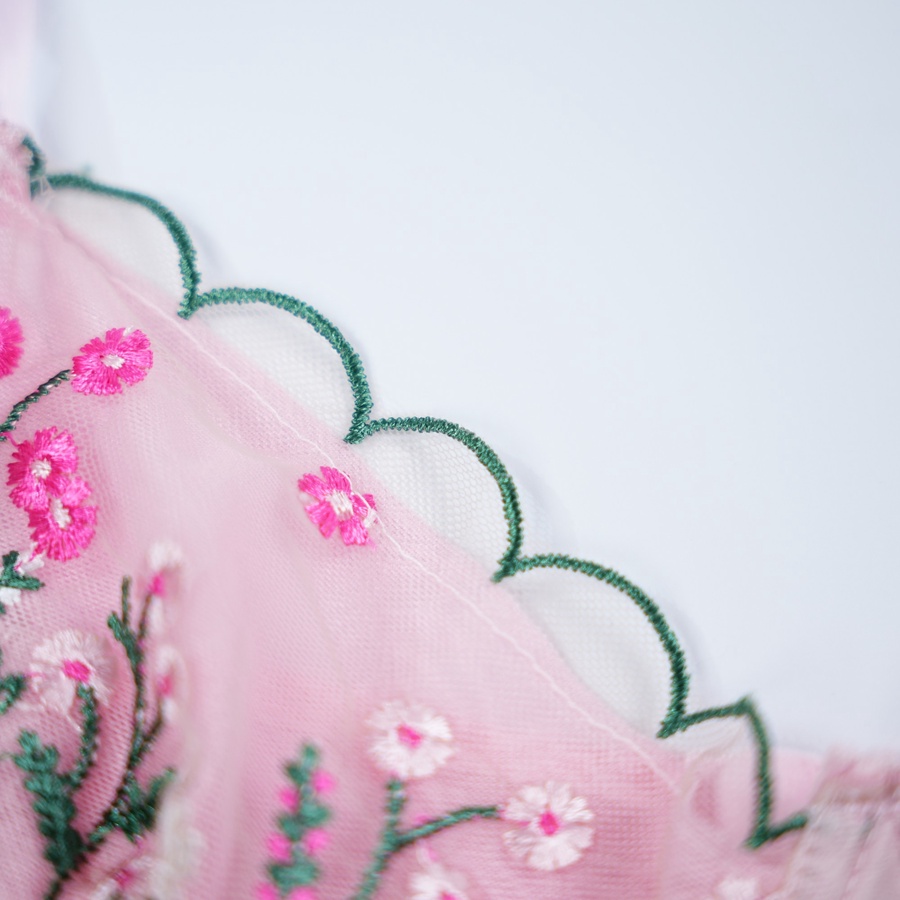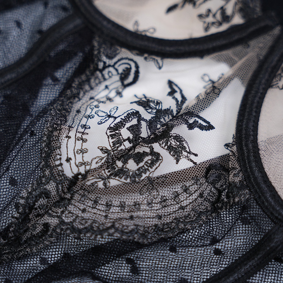 Material: Soft sheer mesh with delicate floral lace and a gentle stretch.