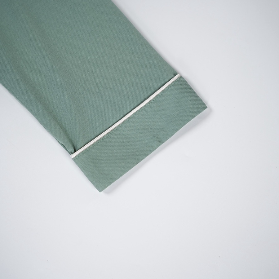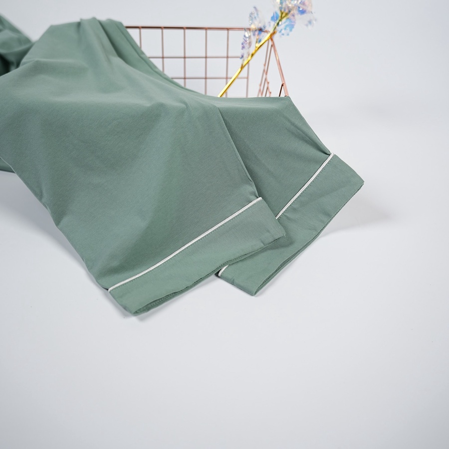 تصميمها كلاسيكي وعملي ومفيهوش أي تفاصيل مزعجة قميص بأزرار عشان يكون سهل في اللبس مع بنطلون واسع ومريح فيه جيوب التفصيلة الصغيرة بتاعة الشريط الأبيض على الأطراف بتديها شكل شيك وراقي.