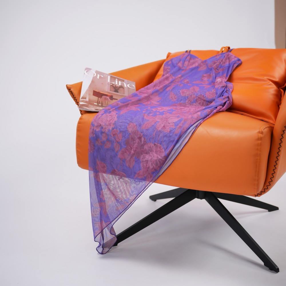 قماش شفاف رقيق بنقشات زهرية رومانسية: مصنوع من قماش خفيف الوزن وشفاف، ومزين بطبعة زهرية معقدة، يتميز هذا الفستان بأشرطة رفيعة وصدرية ضيقة تُبرز قوامك برشاقة.