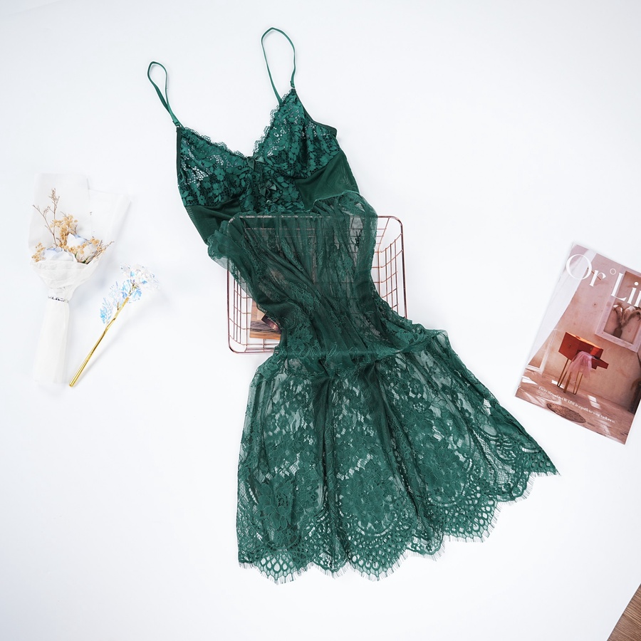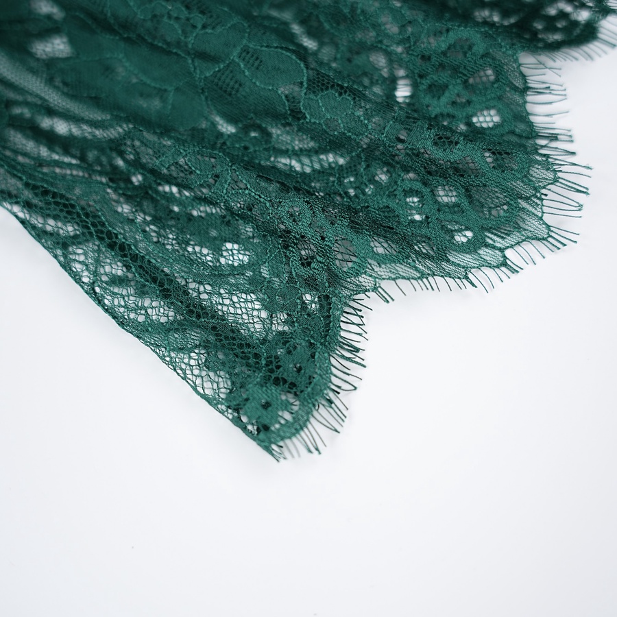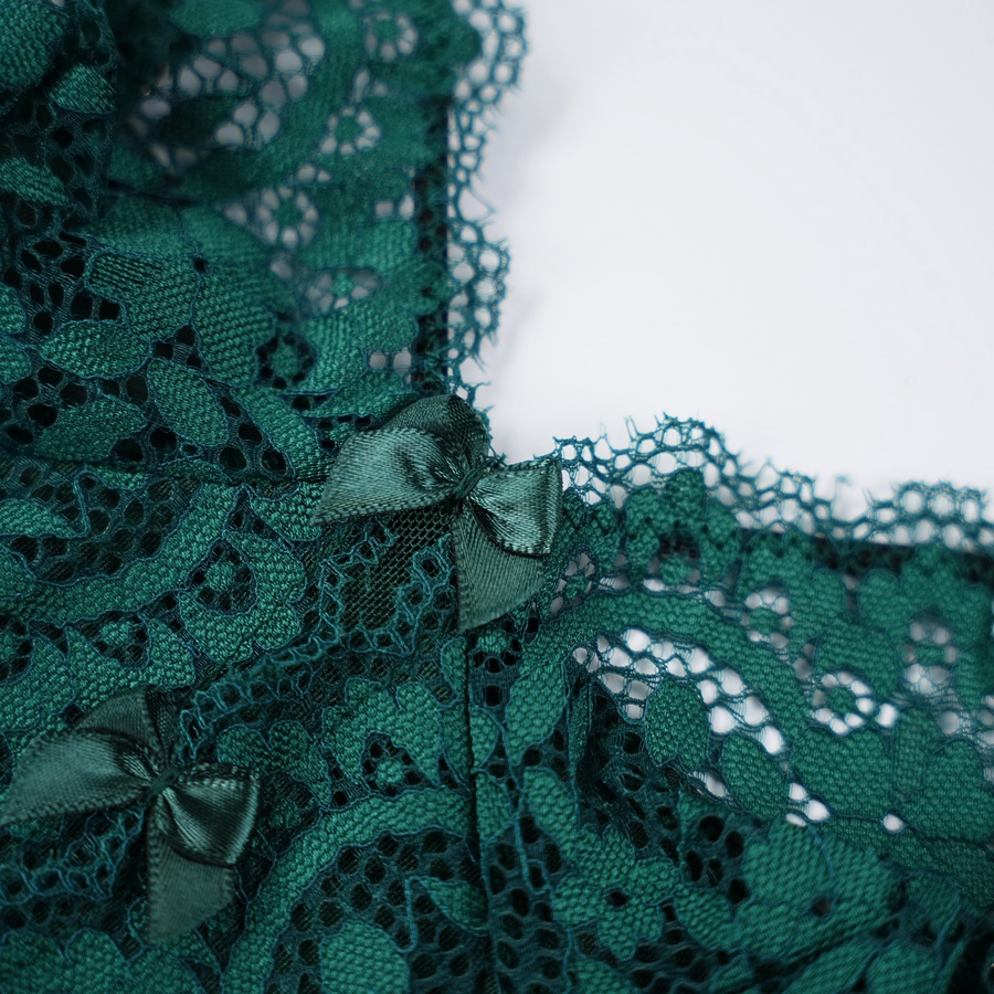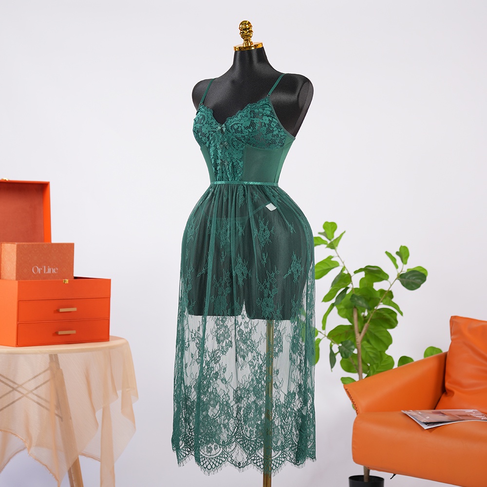 مصنوع من دانتيل أخضر عالي الجودة مزين بنقوش زهرية دقيقة، يوفر هذا الفستان جاذبية رومانسية شفافة وهادئة مع أجواء منعشة ومتطورة.