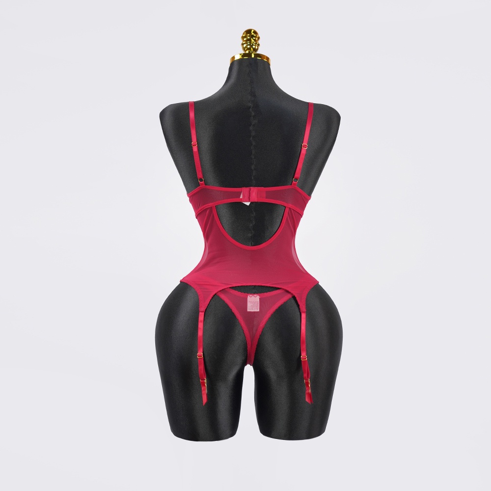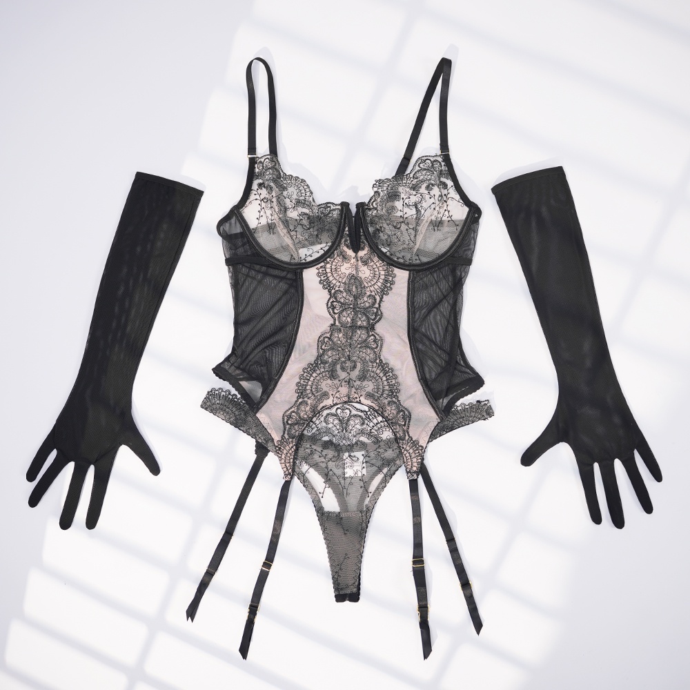 Available in black or red, this lace floral bodysuit blends romance with allure—complete with matching gloves.