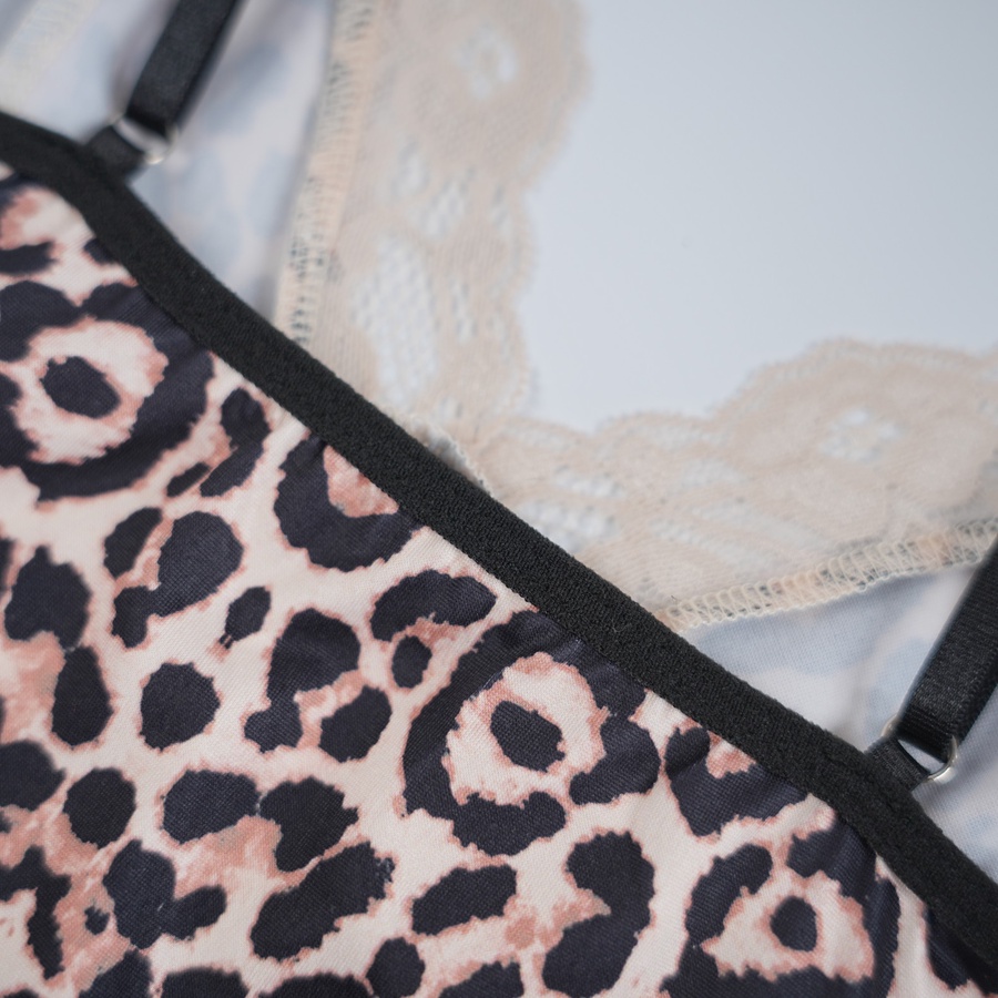 فستان لانجيري جريء بتصميم تايجر قصير، مزين بدانتيل أنثوي مع شقين جانبيين لإطلالة أكثر إثارة. يتميز بحمالات قابلة للتعديل لراحة مثالية تناسب جميع المقاسات.
