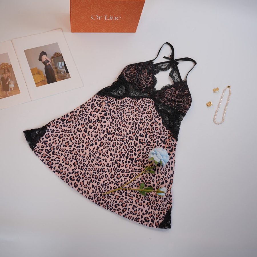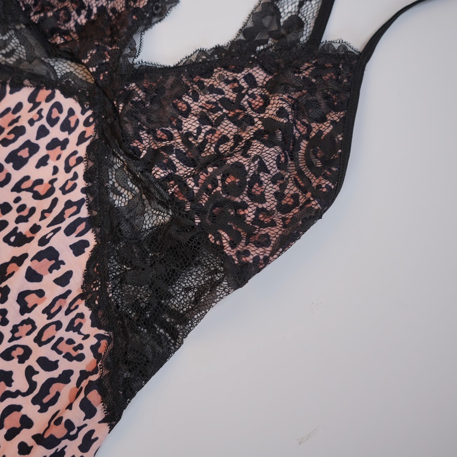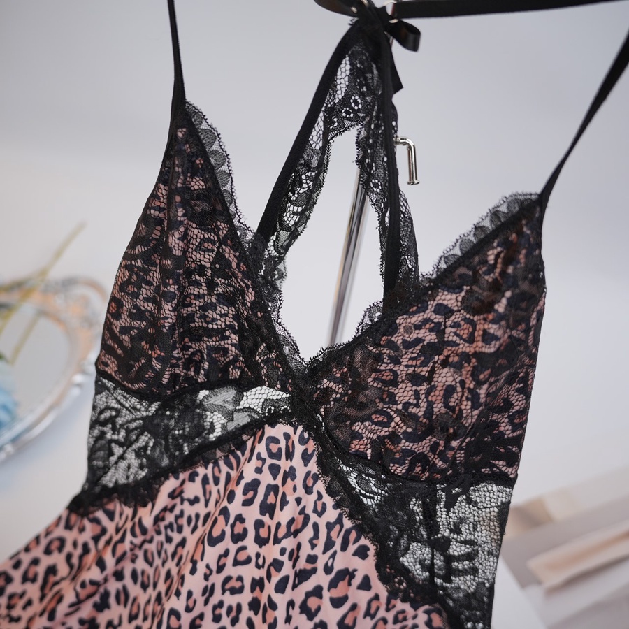 Highlight: Fluid leopard silk framed with delicate black lace for quiet allure.