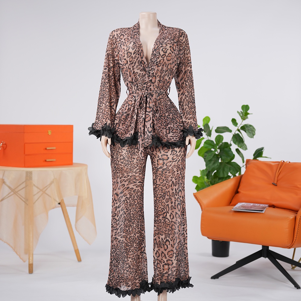 طقم بيجاما حريري من قطعتين يتميز بتصميم كلاسيكي، وأكمام طويلة، وياقة على شكل حرف V، ونقشة جلد الفهد، وأساور متباينة اللون.