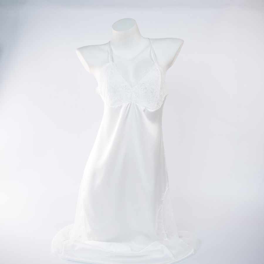 الفخامة الملكية (الساتان الأبيض الطويل): فستان نوم ساتان حريري طويل ودانتيل شيك، بيدي لوك عروسة فخم وبيبرز الأناقة. ملمسه ناعم ولامع عشان يخليكي دايماً متألقة.