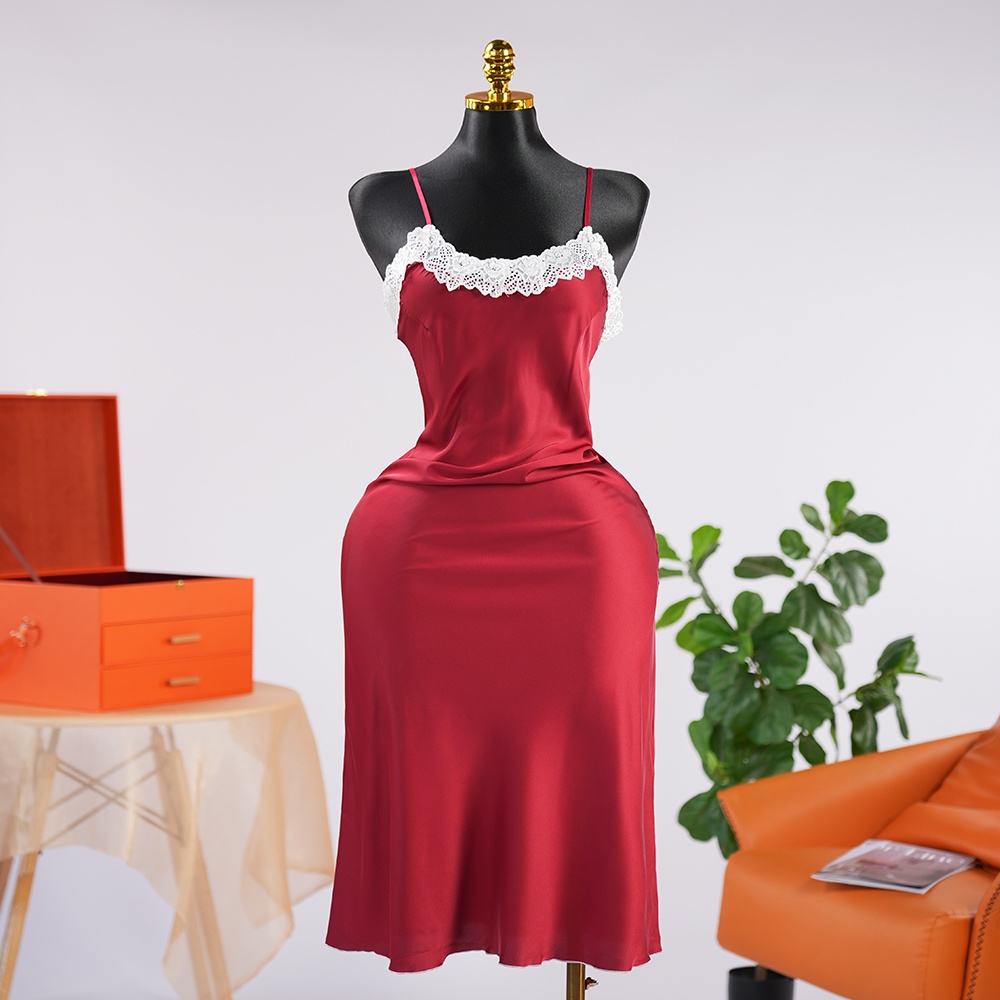 فستان أنيق من الساتان مع حواف دانتيل أنيقة: مصنوع من الساتان الانسيابي، يتميز هذا الفستان بفتحة رقبة ناعمة على شكل حرف V محاطة بدانتيل رقيق، مما يُبرز عظمة الترقوة ويضفي لمسة أنثوية راقية.
