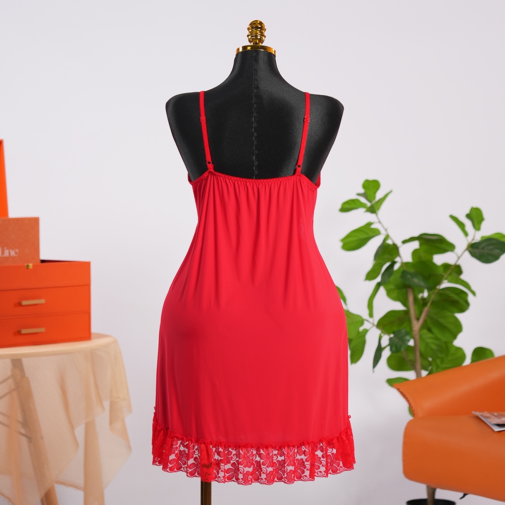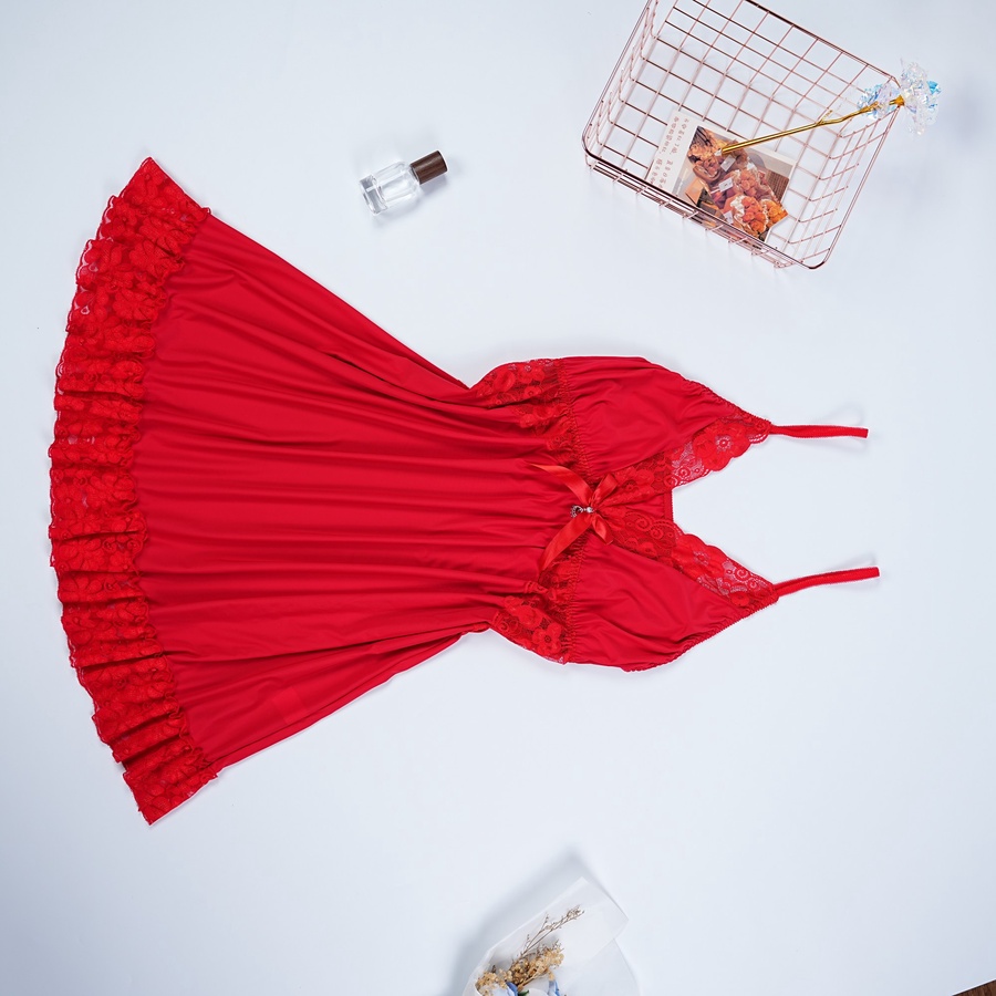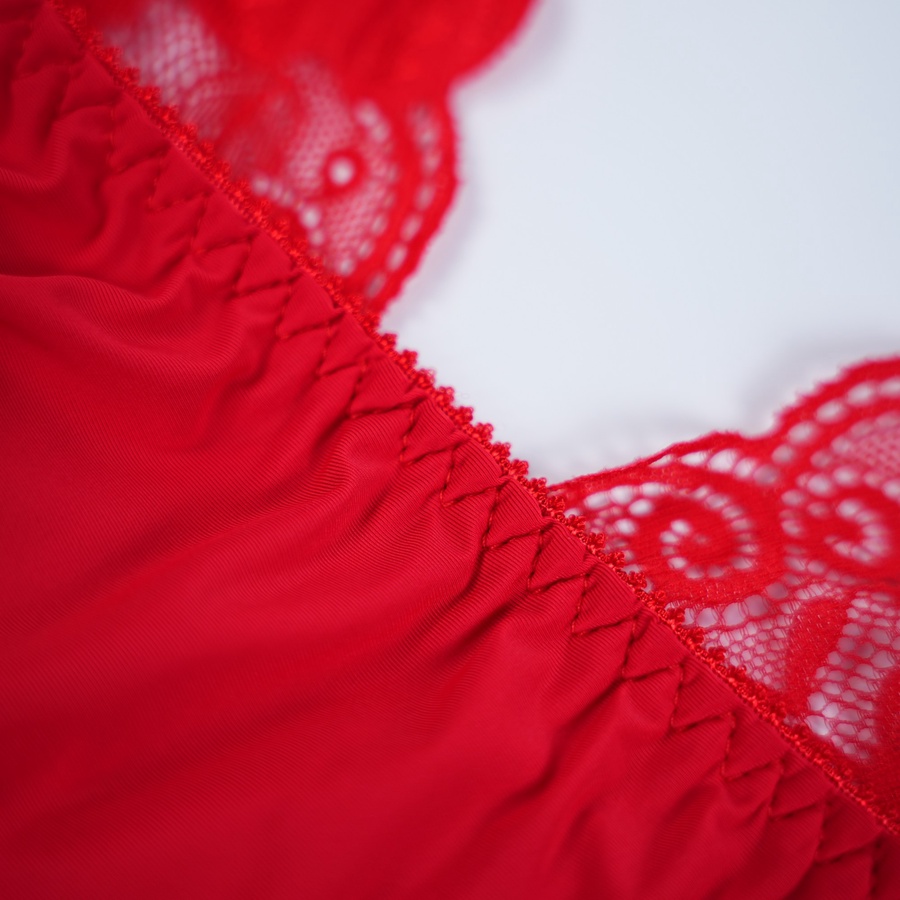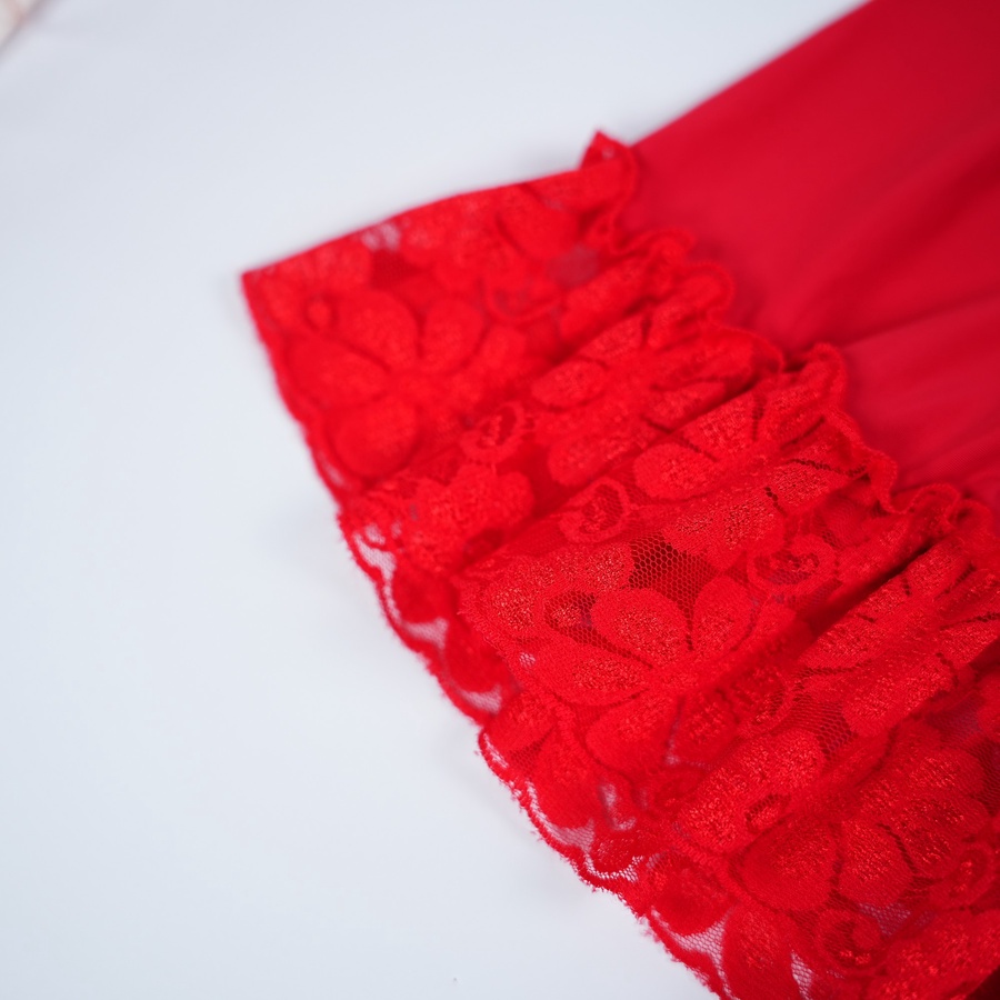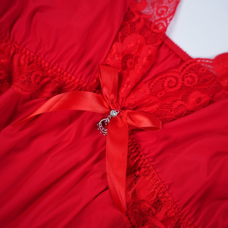 التصميم ده فيه تفاصيل كلها أنوثة منطقة الصدر والجوانب بالكامل متزينة بالدانتيل الأحمر الراقي اللي بيبرز جمالك وفي النص فيونكة ستان بتدي لمسة نهائية رقيقة ديل القميص كمان متزين بكرانيش دانتيل عشان يكمل اللوك الجريء والناعم في نفس الوقت.