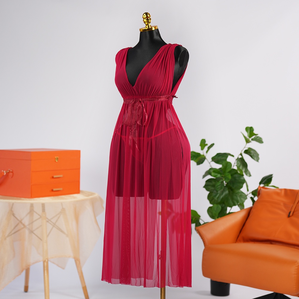 مصنوع من قماش أحمر شفاف رقيق، يتميز بفتحة رقبة عميقة تبرز منحنيات الجسم، وحزام خصر من الدانتيل لإضفاء لمسة راقية. تصميم مفتوح من الأمام يكشف بأناقة عن شورت أحمر متناسق، يمزج بين الجاذبية الجريئة والأناقة الراقية.