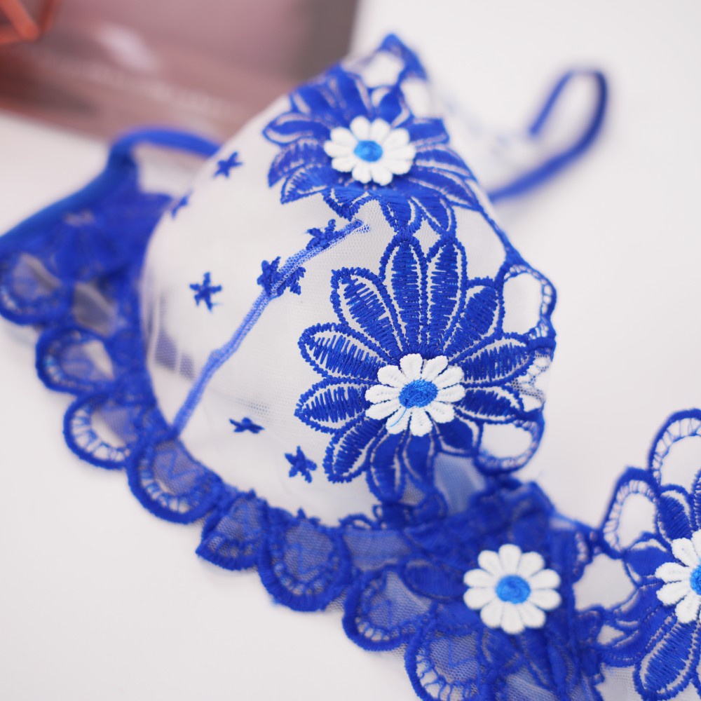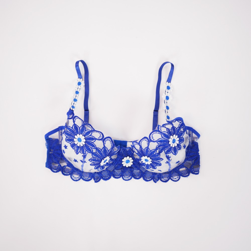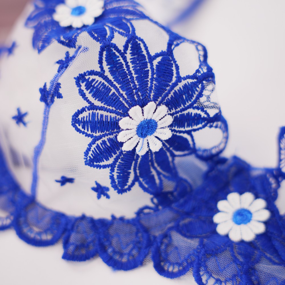 Description: striking masterpiece of electric blue mesh adorned with artisanal floral embroidery for an unapologetically bold feminine statement.