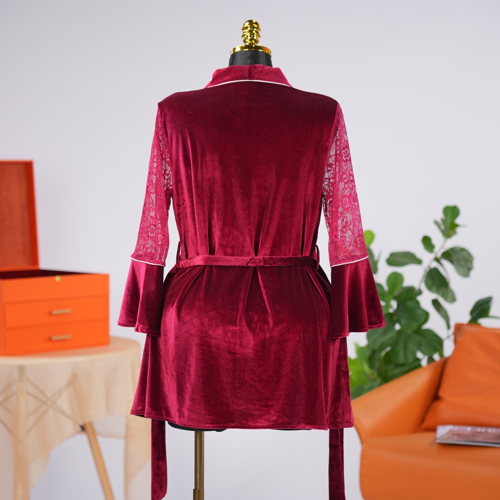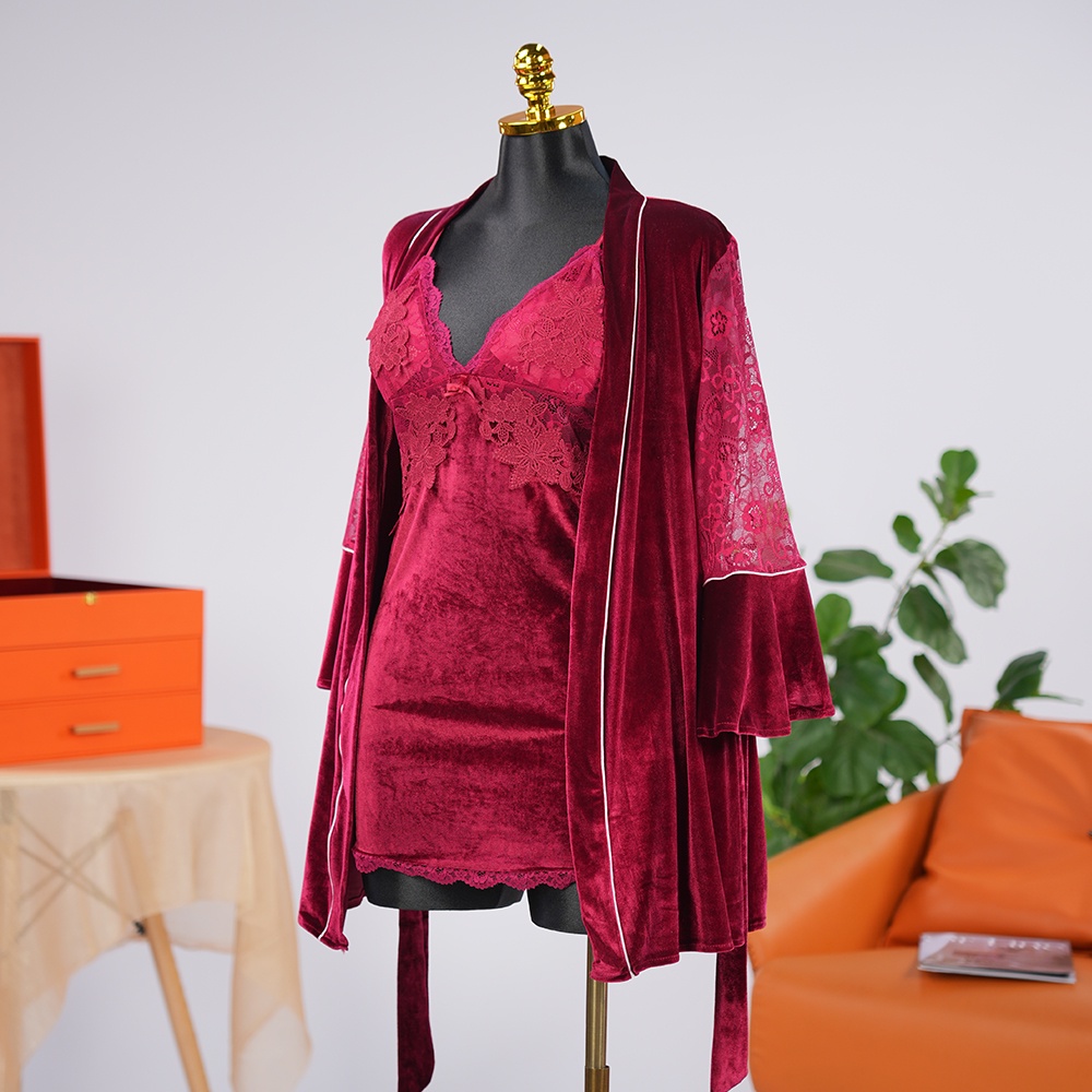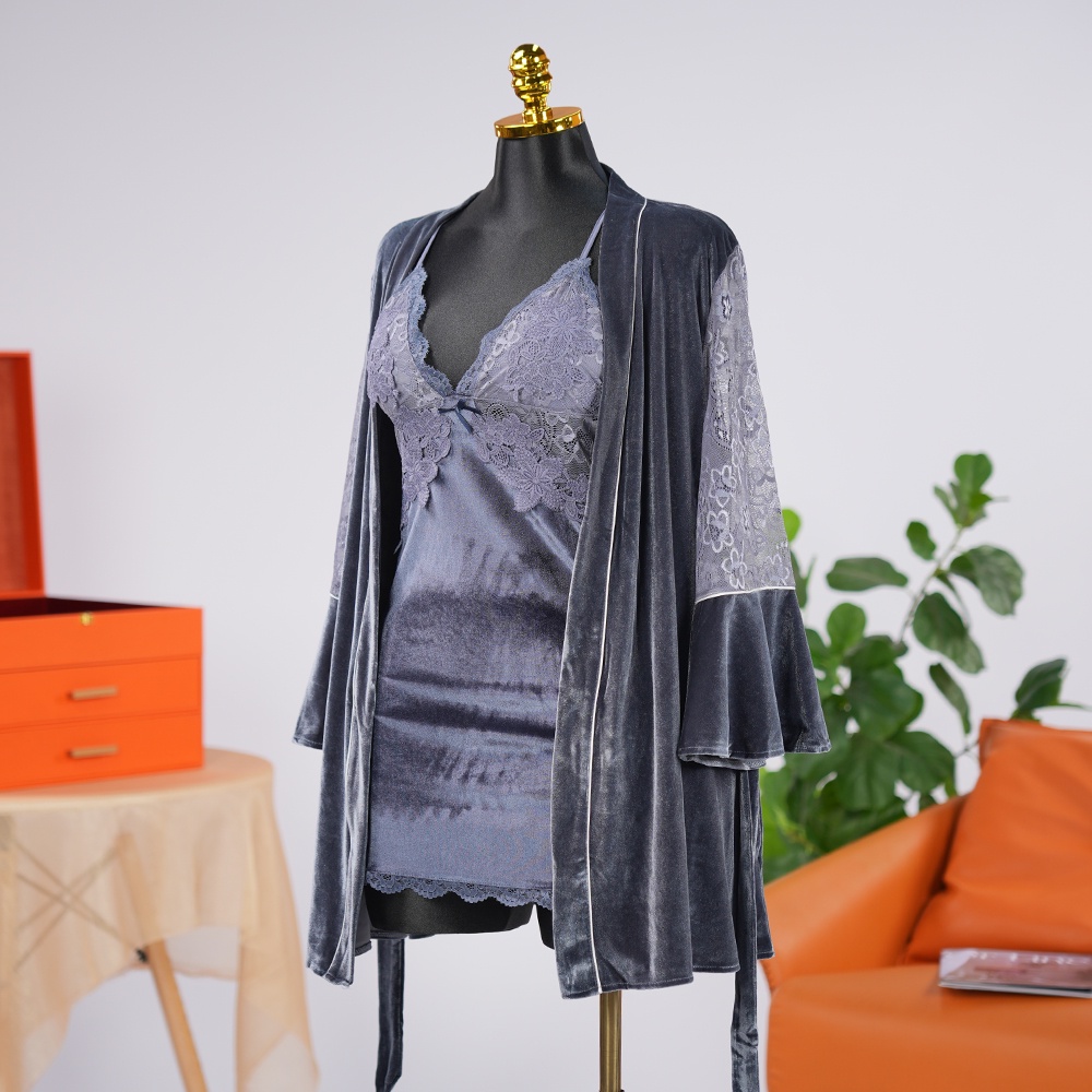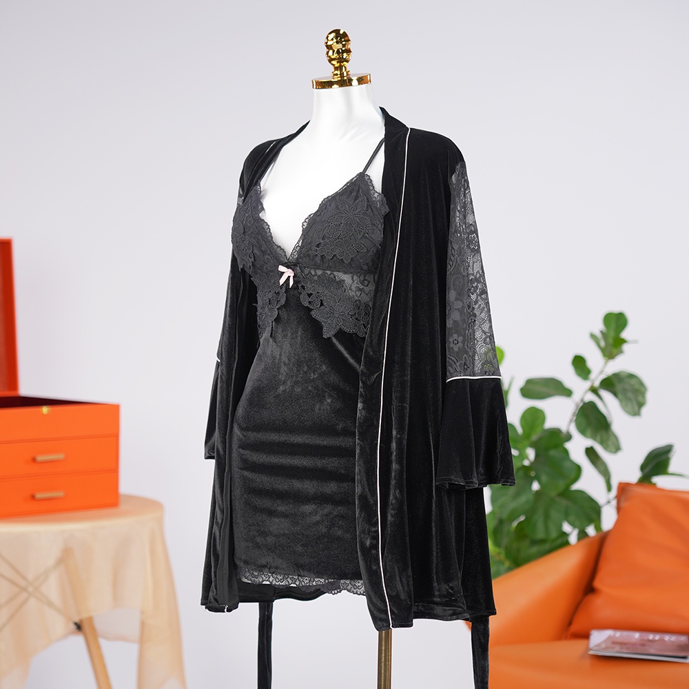 مصنوع من قماش مخملي فاخر، بلمسة نهائية ناعمة ولامعة تُذكرنا بليلةٍ مُرصّعة بالنجوم. يتميز بتفاصيل دانتيل رقيقة على طول خط العنق والحاشية، وأشرطة رفيعة تُعزز التصميم، مما يُبرز عظمة الترقوة والشكل الخارجي برقةٍ وجاذبيةٍ بسيطة.