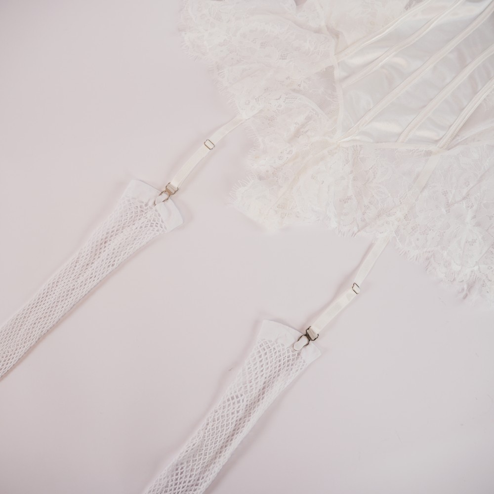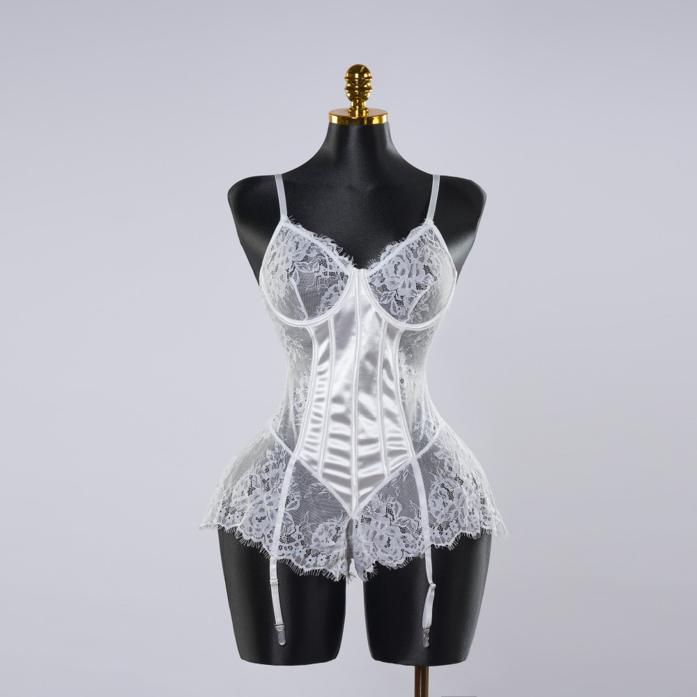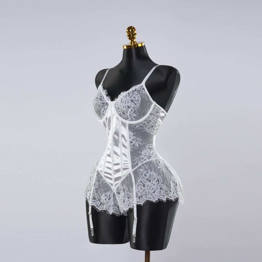 Highlight: Structured lace corsetry softened with sheer layers for a striking, feminine balance